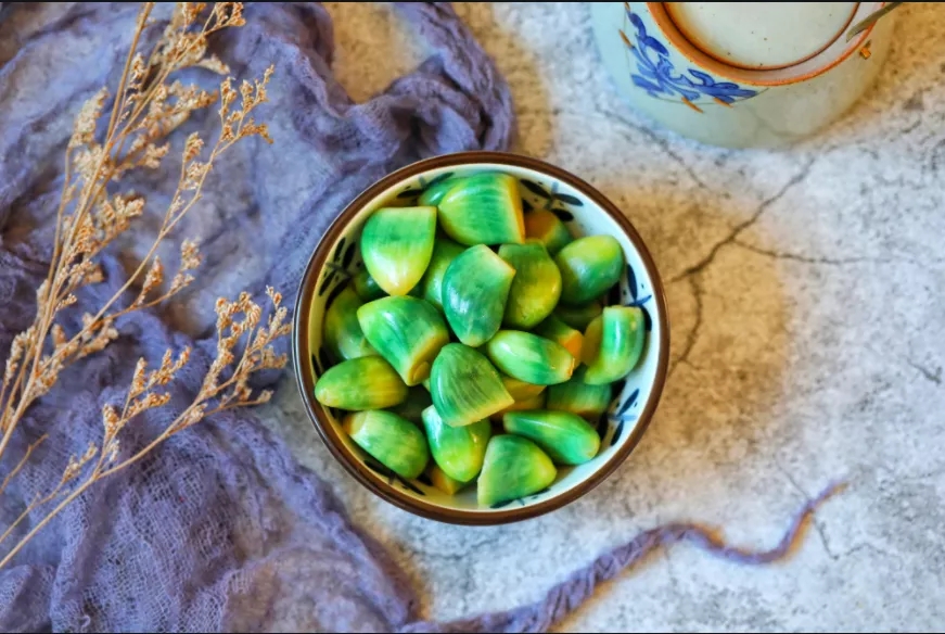 泡腊八蒜用紫皮蒜和米醋,将蒜瓣去老皮,浸入米醋中,装入小坛封严,至除夕启封,蒜瓣湛青翠绿,蒜辣醋酸香溶在一起,扑鼻而来,是吃饺子的最佳佐料,拌凉菜也可以用,味道独特。